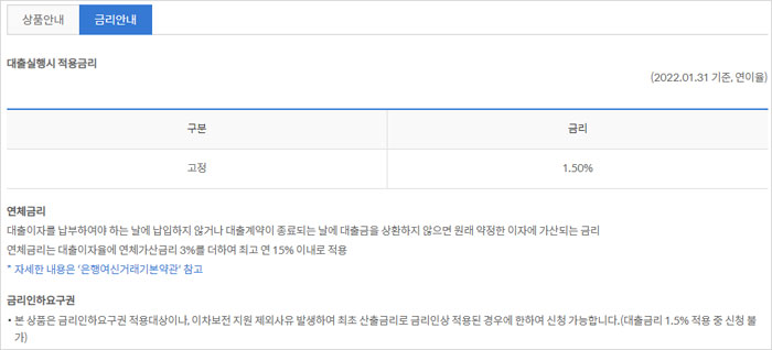 · 상기 최종금리는 대출금액1천만원/대출기간 5년/CD3개월물+1.7%를 기준으로 하였고, 1년차에는 대출금리 중 2.6%의 이자지원을 포함한 적용금리라고 합니다. 단, 이자지원 제외 사유가 발생하게 되면 해당 이자지원율만큼 적용금리가 상승하게 된다고 합니다.