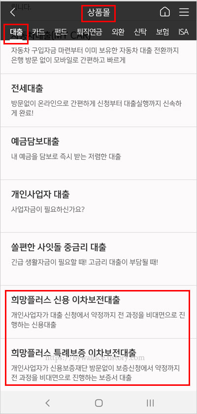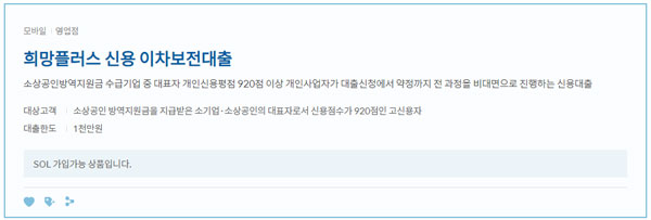 신한은행 홈페이지에서 금융상품몰 및 대출을 클릭하거나 신한 쏠(SOL) 앱에서 상품몰, 대출순으로 클릭하면 중신용자를 위한 신한은행 소상공인 희망대출플러스 희망플러스 특례보증 이차보전대출 상품과 고신용자를 위한 신한은행 소상공인 희망대출플러스 희망플러스 신용 이차보전대출 상품을 확인 할 수 있다고 합니다.