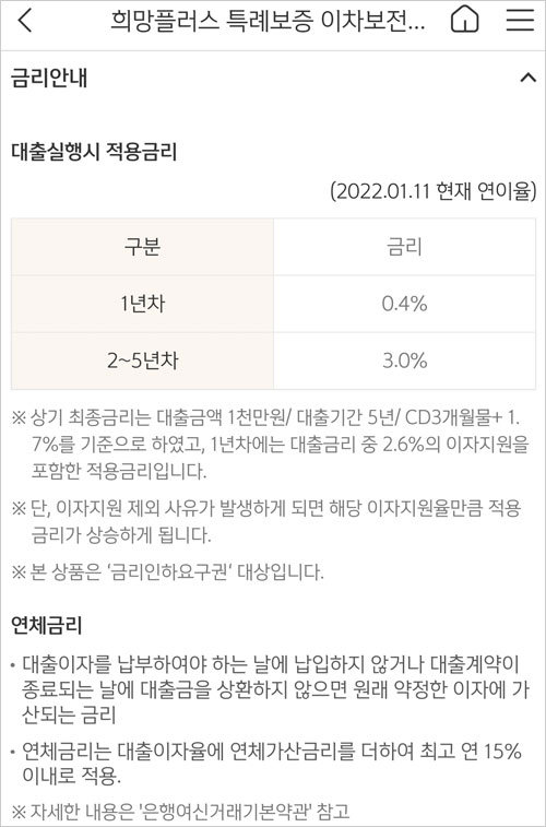 · 상기 최종금리는 대출금액1천만원/대출기간 5년/CD3개월물+1.7%를 기준으로 하였고, 1년차에는 대출금리 중 2.6%의 이자지원을 포함한 적용금리라고 합니다. 단, 이자지원 제외 사유가 발생하게 되면 해당 이자지원율만큼 적용금리가 상승하게 된다고 합니다.