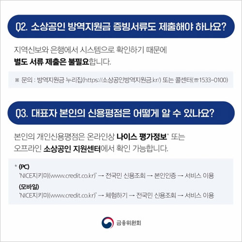 금리는 연 1.5%이며 시중은행의 대출이자와 정책이자 차이를 정부가 지원(이차보전)하는 방식으로 4조8000억원을 공급한다고 합니다. 참고로 소상공인 대표자의 개인신용평점은 나이스(NICE)지키미(www.credit.co.kr) 등을 통해 확인 가능하다고 합니다.