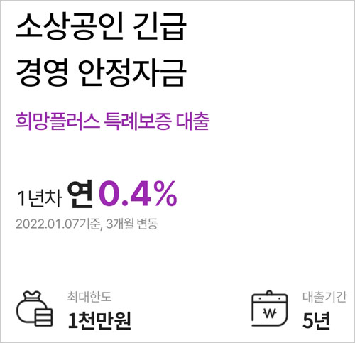 고신용 소상공인 또한 신규 운전자금 또는 대환자금 용도로 빌릴 수 있다고 합니다. 대환자금은 희망대출플러스를 신청한 은행의 기존 대출을 대환하는 조건이라고 합니다. 한도는 사업자별로 1000만원 한도이며 대출 기간은 최대 1년이라고 합니다.