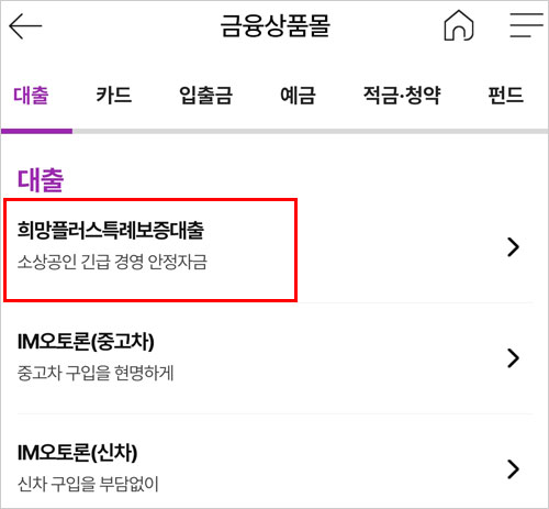 IM뱅크 앱에서 전체메뉴→ 상품몰(금융상품몰)→ 대출→ 순으로 클릭하면 중신용자를 위한 DGB대구은행 소상공인 희망대출플러스 희망플러스 특례보증 대출 상품을 확인할 수 있다고 합니다.