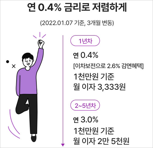 - 금리: 기준금리 1.3%(CD연동기준금리3개월)+1.7%(가산금리)-2.60%(이차보전)