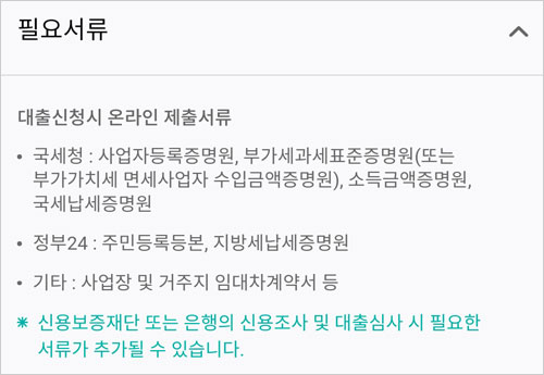 - 기타: 사업장 및 거주지 임대차계약서 등, 다만 신용보증재단 또는 은행의 신용조사 및 대출심사시 필요한 서류가 추가될 수 있다고 합니다.