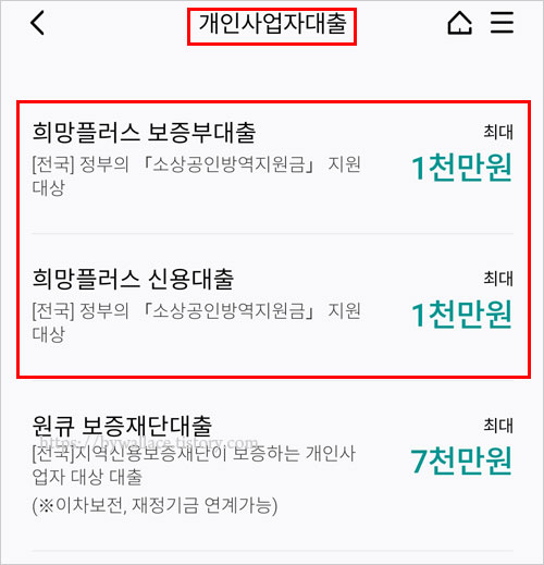 하나원큐 앱에서 상품가입→ 대출→ 개인사업자대출순으로 클릭하면 중신용자를 위한 하나은행 소상공인 희망대출플러스 희망플러스 보증부대출 상품과 고신용자를 위한 하나은행 소상공인 희망대출플러스 희망플러스 신용대출 상품을 확인 할 수 있다고 합니다.