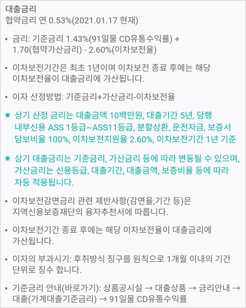- 금리: 기준금리 1.43%(91일물 CD유통수익률)+1.70(협약가산금리)-2.60%(이차보전율)