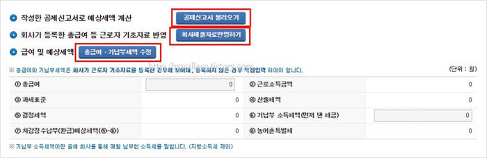 아마 연말정산 간소화 자료를 조회 한 후에 예상세액을 계산하는 법과 비슷하게 나오는데요. 다만 다른점은 연말정산 간소화 서비스에서는 소득공제와 세액공제가 자동으로 채워지고 국세청 연말정산 자동계산에서는 모든 것을 직접 입력해야 한답니다.