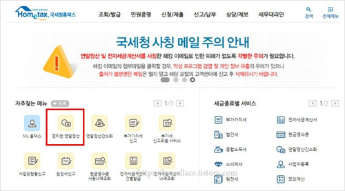 주요서비스 안내 및 부가서비스 안내가 보입니다. 부가서비스 안내에 예상세액 계산하기가 있습니다. 예상세액 계산하기를 클릭합니다. 물론 인증을 해야 이용을 할 수 있는 항목입니다.