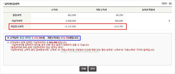 참고로 위의 금액은 예시를 들어 입력한 후 나온 연말정산 환급금 결과입니다. 예시 계산에서는 돌려받는 것으로 나왔습니다. 이런 연말정산 환급금 지급 결과가 나왔으면 정말 좋겠습니다.