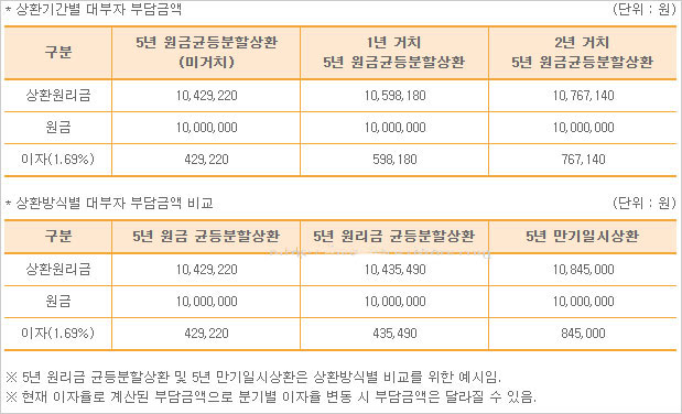 ※ 5년 원리금 균등분할상환 및 5년 만기일시상환은 상환방식별 비교를 위한 예시라고 합니다.