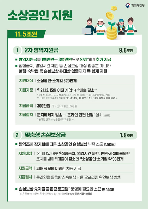 손실보상 대상을 중기업(연매출 100억 원 이하) 및 시설 인원제한 업종 중 보상 대상에서 제외된 식당 및 카페까지 확대하기 위해 총 2조 5500억 원을 증액하는 등 소상공인시장진흥기금에서 총 24조 9500억 원을 증액해 수정의결 했다고 합니다.
