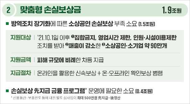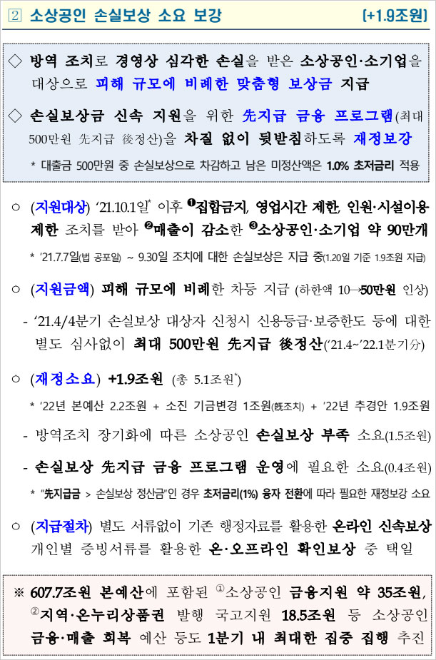 300만원 소상공인 방역지원금 지급기준 및 대상자 추가지원 등과 함께 소상공인 손실보상 예산을 1조9000억원 보강하기로 했다고 합니다. 최대 500만원의 보상금을 선 지급, 후 정산하는 금융 프로그램을 운영하기 위해 재정을 보강했다고 합니다. 이에 따라 소상공인 손실보상 재원은 총 5조1000억원으로 증액됐다고 합니다.