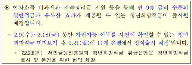 청년희망적금 가입희망자는 오는 2월 9일부터 18일까지 청년희망적금 자격조회가 가능한 청년희망적금 미리보기 서비스를 통해 정식출시 전 청년희망적금 가입가능 여부를 미리 확인할 수 있다고 합니다.