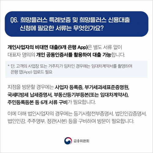 고신용 프로그램 희망플러스 신용대출 필요 서류에 대해 알아보면 개인사업자의 비대면 대출(8개 은행 App)은 별도 서류 없이 대표자 명의의 개인 공동인증서를 활용하여 대출이 가능하다고 합니다. 마찬가지로 사업장 또는 거주지가 임차인 경우에는 임대차계약서를 촬영하여 은행 앱(App) 업로드가 필요하다고 합니다.