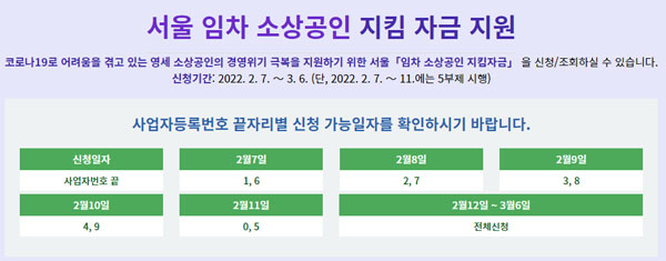 임차 소상공인 서울시 자영업자 100만원 지킴자금 신청방법은 서울지킴자금.kr 사이트를 통한 온라인 신청이 원칙이라고 합니다. 5일간(2월 7일~11일)은 사업자등록번호 끝자리로 5부제를 시행하고, 12일부터는 번호와 상관없이 신청할 수 있다고 합니다.
