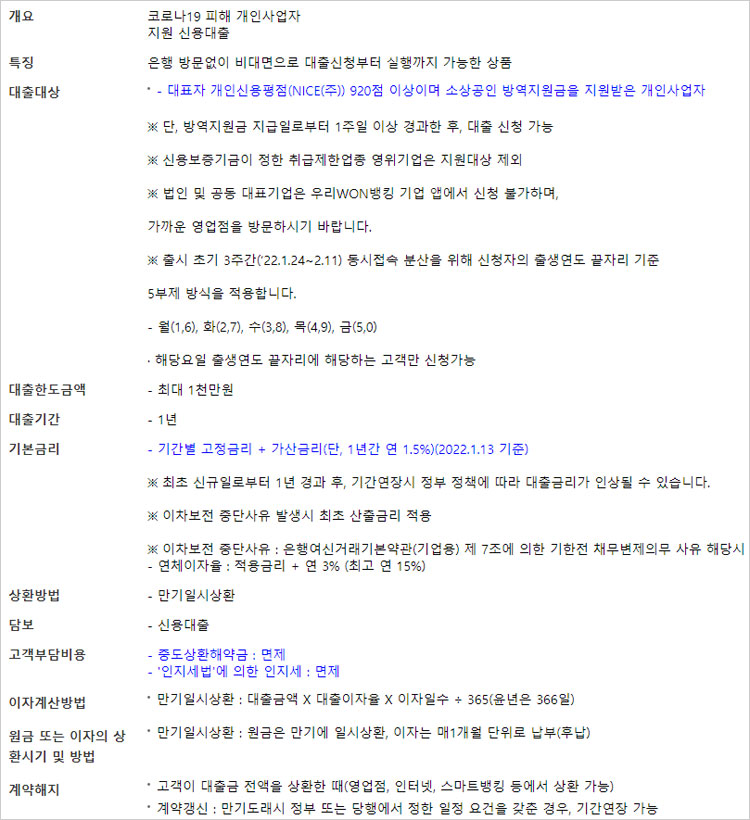 소상공인 희망대출플러스 우리은행 대출자격, 대상, 대출금리 이율 및 대출기간, 상환방법 등 보다 자세한 상품 안내는 우리WON뱅킹 기업 앱이나 우리은행 홈페이지에서 확인 할 수 있다고 합니다.