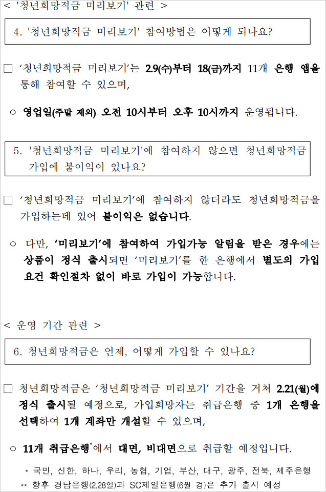 청년희망적금 미리보기 서비스 참여자는 상품이 정식 출시되면 미리보기를 한 은행에서 다시 가입요건(연령 및 개인소득) 확인절차를 거치지 않고 바로 가입할 수 있다고 합니다.
