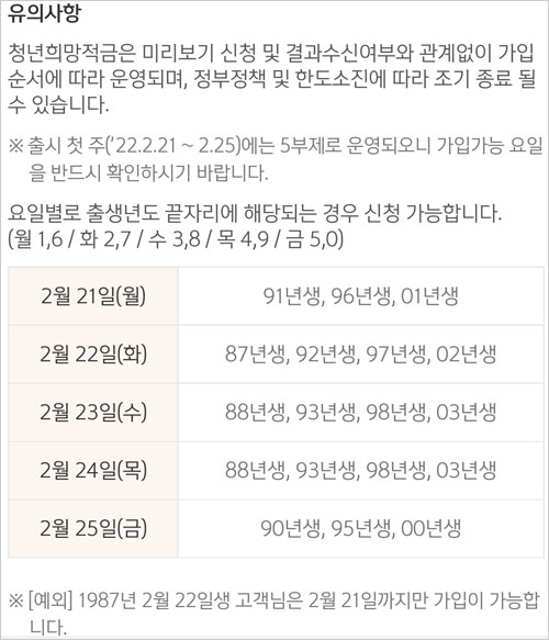 21~25일에는 출생년도에 따른 5부제 가입방식이 적용된다고 합니다. 신한은행 청년희망적금 신청기간은 올해 12월 31일까지라고 합니다. 따라서 올해 말까지 가입해야 이자소득 비과세 지원을 받을 수 있다고 합니다.