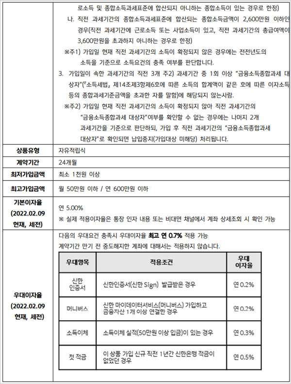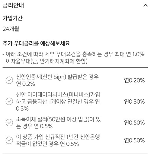 - 신한은행의 자체모바일 인증서 '신한인증서' 발급시 연 0.2%p, 신한은행 마이데이터 서비스 머니버스를 가입 및 1개 이상 금융자산 연결시 연 0.3%p, 50만원 이상의 소득 이체 실적 연 0.5%p, 신규일 직전 1년간 신한은행 적금 미보유 고객에게 0.5%p 우대금리