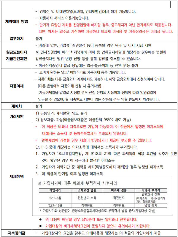 - 만기전 중도해지시 중도해지이자 적용, 비과세 혜택 불가 및 저축장려금 미지급.