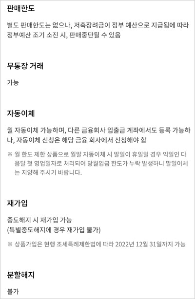 - 2022년 2월 21일~2022년 12월 31일까지 가입가능. 다만 정부정책 및 관련법률 등이 변경될 경우 판매가 조기 마감 될 수 있습니다.