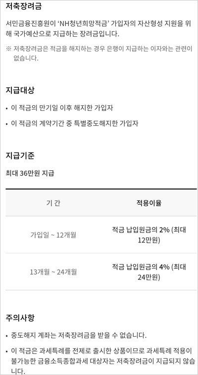 NH농협 청년희망적금은 은행 이자와 함께 별도 최대 4%를 저축장려금으로 지급한다고 합니다. 월 50만원씩 2년간 적금을 넣으면 최대 36만원의 저축장려금을 지급되며 이자소득세가 부과되지 않는다고 합니다.