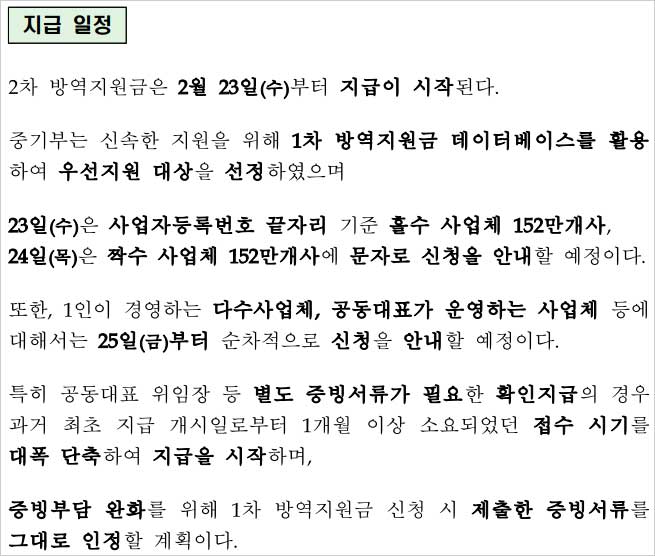 23일(수)은 사업자등록번호 끝자리 기준 홀수 사업체 152만개사, 24일(목)은 짝수 사업체 152만개사에 문자로 신청을 안내할 예정이라고 합니다. 또한 1인이 경영하는 다수사업체, 공동대표가 운영하는 사업체 등에 대해서는 25일(금)부터 순차적으로 신청을 안내할 예정이라고 합니다.