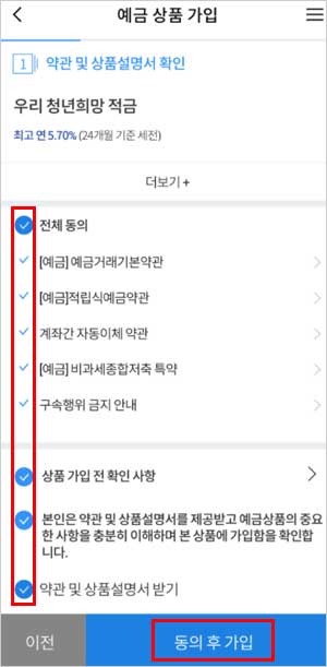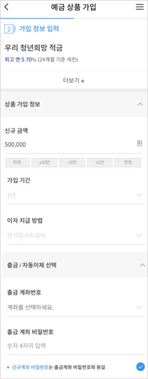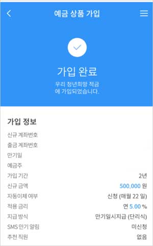 4. 금액, 계좌번호, 자동이체, 계좌 비밀번호 등 가입정보를 입력합니다. 5. 가입정보를 확인합니다. 6. 우리은행 청년희망적금 신청방법이 완료됩니다.