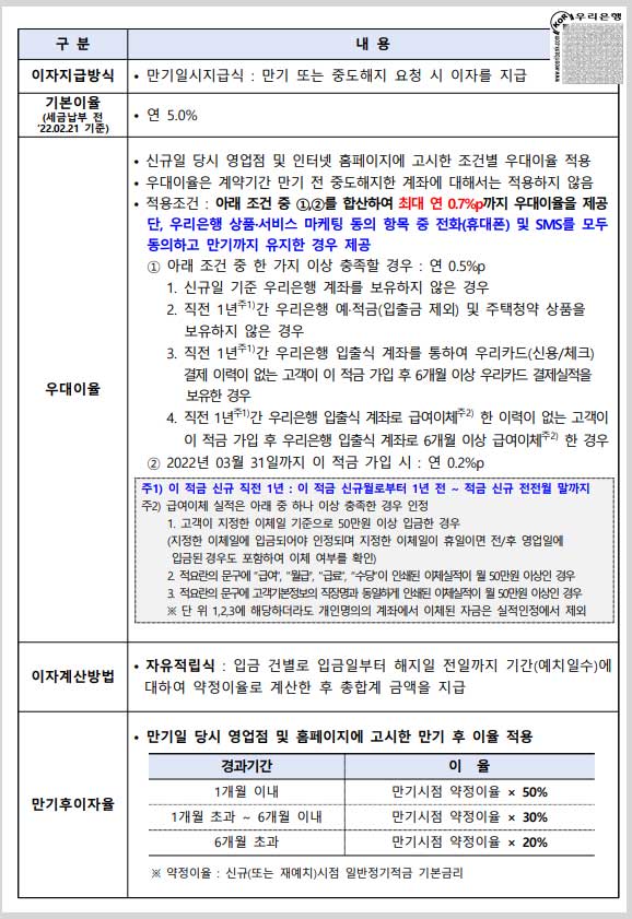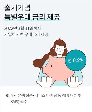 - ▲우리은행 첫거래 ▲우리은행 예금, 적금, 청약 미보유 ▲직전 1년간 우리은행 입출식카드로 우리은행 결제이력 없음 ▲적금 가입 후 6개월 이상 우리카드 결제 실적 보유 ▲적금 가입 후 우리은행 입출식 계좌로 6개월 이상 급여이체 등 조건 중 1가지 이상 충족시 연 0.5%p, 3월 21일까지 적금가입시 연 0.2%p 우대금리