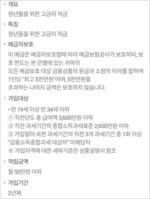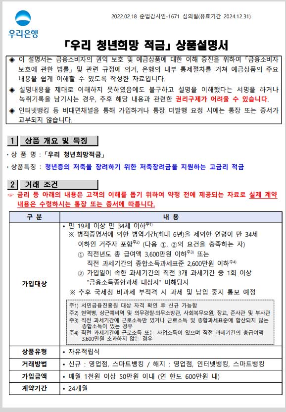 ▣ 우리은행 청년희망적금 신청 방법 및 가입대상 자격조건 요약설명서