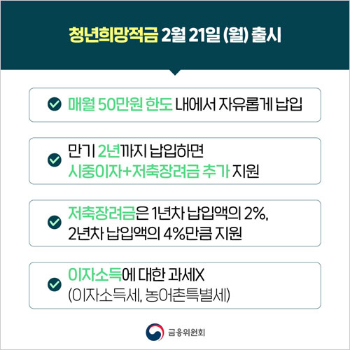 청년희망적금 저축장려금은 1년차 납입액의 2%, 2년차 납입액의 4% 만큼 지원된다고 합니다. 매월 50만원씩 2년간 납입하면 최대 36만원을 받는 방식이라고 합니다. 또한 이자소득에 대한 이자소득세(세율 14%), 농어촌특별세(세율 1.4%)는 과세되지 않는다고 합니다.