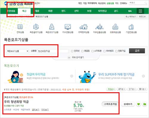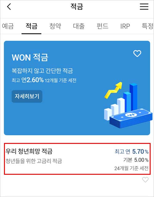 우리WON뱅킹 앱에서 상품몰 → 예적금/신탁/청약→ 예적금상품→적금 →우리청년희망적금순으로 클릭하면 우리은행 청년희망적금 신청방법 및 우리은행 청년희망적금 가입방법, 자격조건, 기본금리, 우대금리 등을 확인할 수 있다고 합니다.