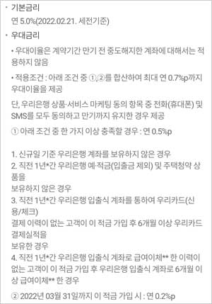 - ▲우리은행 첫거래 ▲우리은행 예금, 적금, 청약 미보유 ▲직전 1년간 우리은행 입출식카드로 우리은행 결제이력 없음 ▲적금 가입 후 6개월 이상 우리카드 결제 실적 보유 ▲적금 가입 후 우리은행 입출식 계좌로 6개월 이상 급여이체 등 조건 중 1가지 이상 충족시 연 0.5%p, 3월 21일까지 적금가입시 연 0.2%p 우대금리