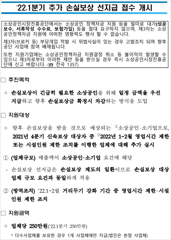 ◈ 2022 1분기 소상공인 손실보상금 250만원 선지급 문의처