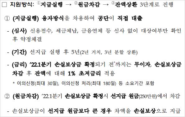 - (금리) ’22.1분기 손실보상금 확정되기 전*까지는 무이자, 손실보상금차감 후 잔액에 대해 1% 초저금리 적용