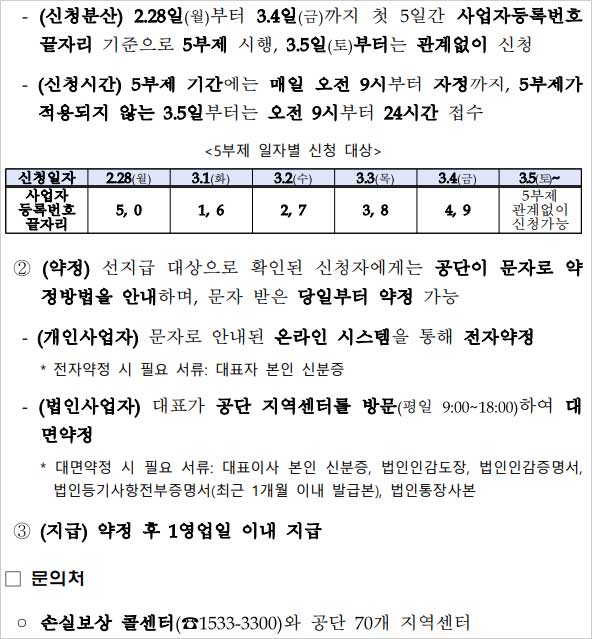 - (신청분산) 2.28일(월)부터 3.4일(금)까지 첫 5일간 사업자등록번호 끝자리 기준으로 5부제 시행, 3.5일(토)부터는 관계없이 신청