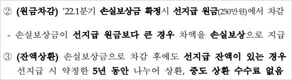 2. (원금차감) ’22.1분기 손실보상금 확정시 선지급 원금(250만원)에서 차감