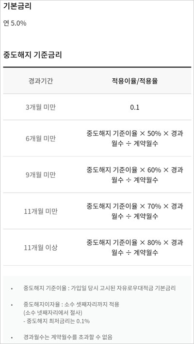 - 초입급/매월 1천원 이상~매월50만원 이하금액을 만기일 전일까지 자유적립
