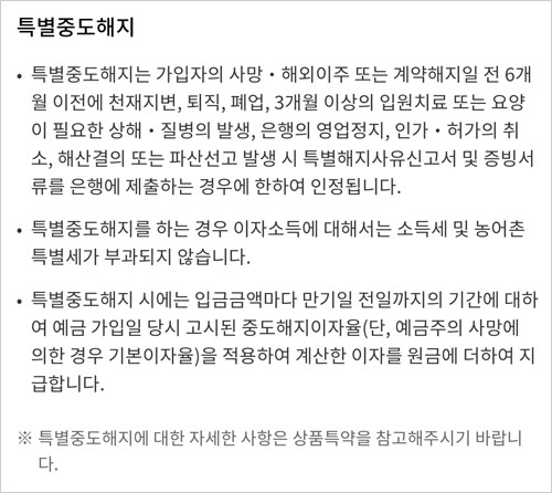 - 특별중도해지를 하는 경우 이자소득에 대해서는 소득세 및 농어촌 특별세가 부과되지 않습니다.