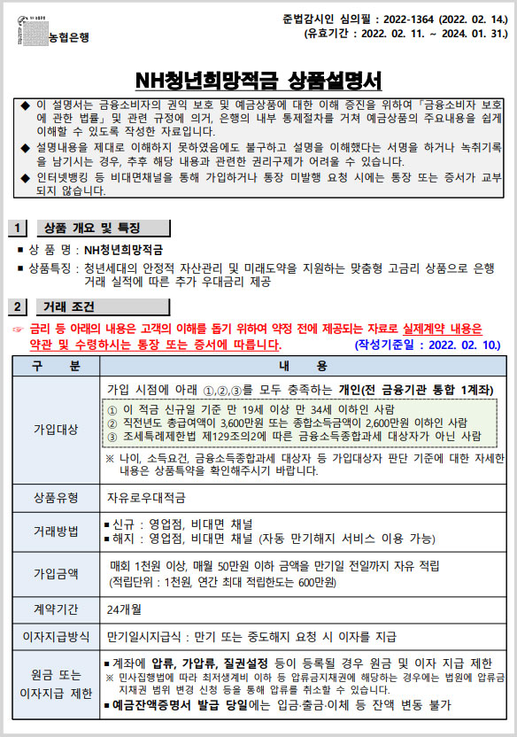 ▣ 청년희망적금 농협 이율 기본금리 우대금리 조건 및 가입대상 자격조건 신청방법 요약설명서
