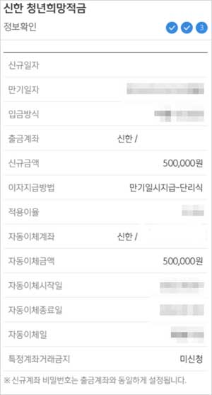 4. 신규금액, 계좌번호, 자동이체 설정, 계좌 비밀번호 등 가입정보를 입력합니다. 5. 청년희망적금 신한은행 가입정보를 확인합니다. 6. 청년희망적금 신한은행 신청방법이 완료됩니다.