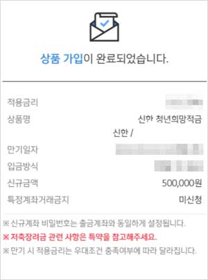 4. 신규금액, 계좌번호, 자동이체 설정, 계좌 비밀번호 등 가입정보를 입력합니다. 5. 신한은행 청년희망적금 가입정보를 확인합니다. 6. 신한은행 청년희망적금 가입방법 및 신청방법이 완료됩니다.