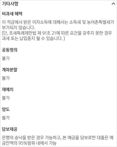 - 비과세 혜택(이 적금에서 받은 이자소득에 대해서는 소득세 및 농어촌특별세가 부가되지 않습니다. 단 요건을 갖추지 못한 경우 과세 또는 납입중지 될 수 있습니다.)