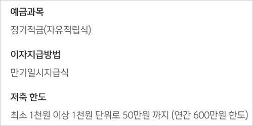 - 지급방법: 만기해지시 납입원금 및 이자와 합산하여 지급(비과세)