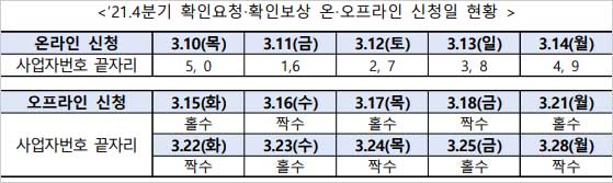 온라인 신청은 10일(목)부터 14일(월)까지 첫 5일간 사업자등록번호 끝자리를 기준으로 5부제를 적용하고, 오프라인 신청은 15일(화)부터 28일(월)까지 10일간 홀짝제로 운영된다고 합니다.