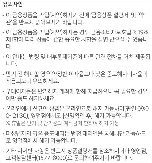 - 비과세 혜택(이 적금에서 받은 이자소득에 대해서는 소득세 및 농어촌특별세가 부가되지 않습니다. 단 요건을 갖추지 못한 경우 과세 또는 납입중지 될 수 있습니다.)
