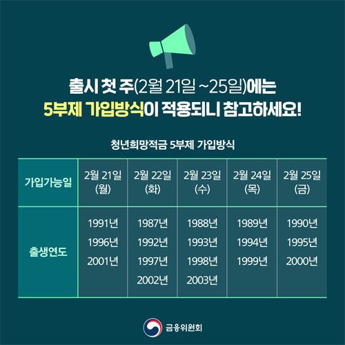 21~25일에는 출생년도에 따른 5부제 가입방식이 적용된다고 합니다. 청년희망적금 신한은행 신청기간은 올해 12월 31일까지였으며 올해 말까지 가입해야 이자소득 비과세 지원을 받을 수 있었다고 합니다. 하지만 청년희망적금 조기매진 우려가 커짐에 따라 청년희망적금 신청기간 가입기간을 3월 4일까지 연장하고 요건을 충족하면 전원 가입할 수 있도록 계획을 수정했다고 합니다.