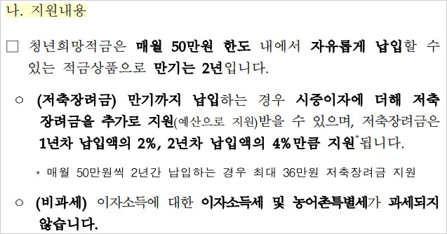 청년희망적금 저축장려금은 1년차 납입액의 2%, 2년차 납입액의 4% 만큼 지원된다고 합니다. 매월 50만원씩 2년간 납입하면 최대 36만원을 받는 방식이라고 합니다. 또한 이자소득에 대한 이자소득세(세율 14%), 농어촌특별세(세율 1.4%)는 과세되지 않는다고 합니다.