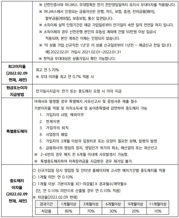 - 신한은행의 자체모바일 인증서 '신한인증서' 발급시 연 0.2%p, 신한은행 마이데이터 서비스 머니버스를 가입 및 1개 이상 금융자산 연결시 연 0.3%p, 50만원 이상의 소득 이체 실적 연 0.5%p, 신규일 직전 1년간 신한은행 적금 미보유 고객에게 0.5%p 우대금리