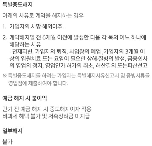 - 특별중도해지 사유 발생시 비과세 혜택 적용, 특별해지사유신고서 및 증빙서류를 영업점에 제출.